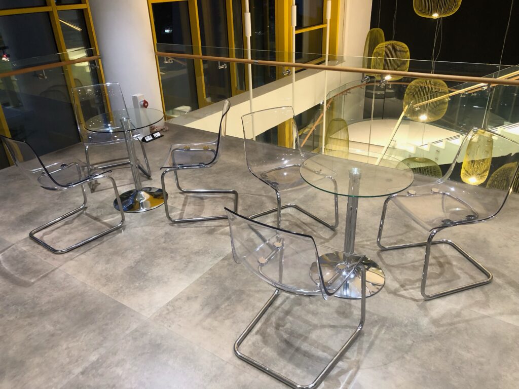 Átlátszó szék, felveszi a környezete színeit, kényelmes és rugalmas az ülése.